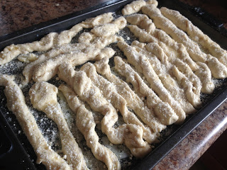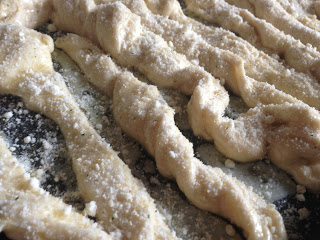 - Roll out dough and cut into strips.