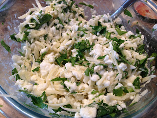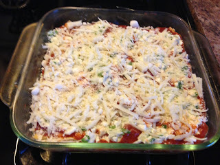 Combine cottage cheese, 1 1/2 cups mozzarella cheese (leave 1/2 cup for topping each layer), parmesan cheese, and chopped spinach (I used fresh) in a bowl. You will use this to layer the lasagna.
