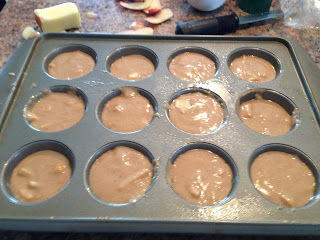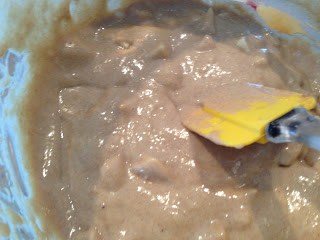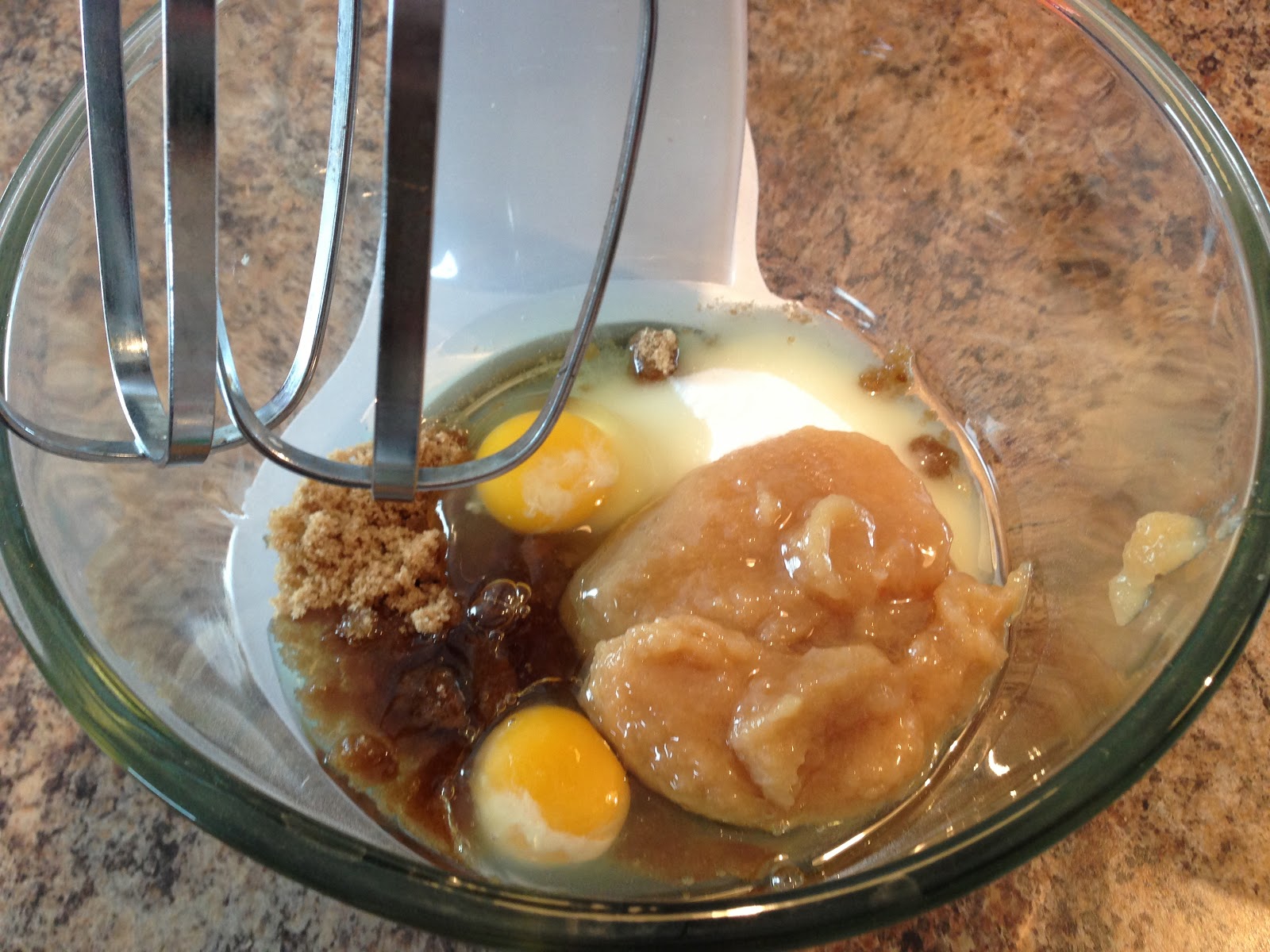 In a large bowl, mix together the sugars, eggs, oil, vanilla and applesauce. In a separate bowl, mix together the flours, baking powder, soda, salt and spices.